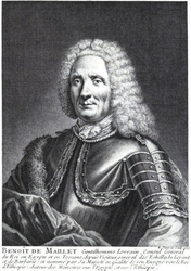 | Personnage : |  | Benoît de Maillet (né le 12 avril 1656 à Saint-Mihiel - mort le 30 janvier 1738 à Marseille), consul de France en Égypte et inspecteur des Établissements français au Levant, est l'auteur d'une œuvre clandestine le Telliamed, théorie sur l'histoire de la Terre qui influença les naturalistes des Lumières tels Lamarck et Darwin et rompit avec le mythe du déluge biblique.